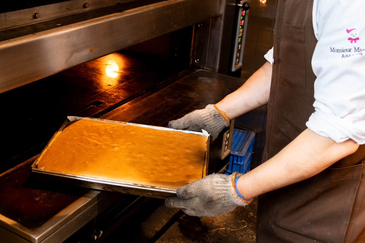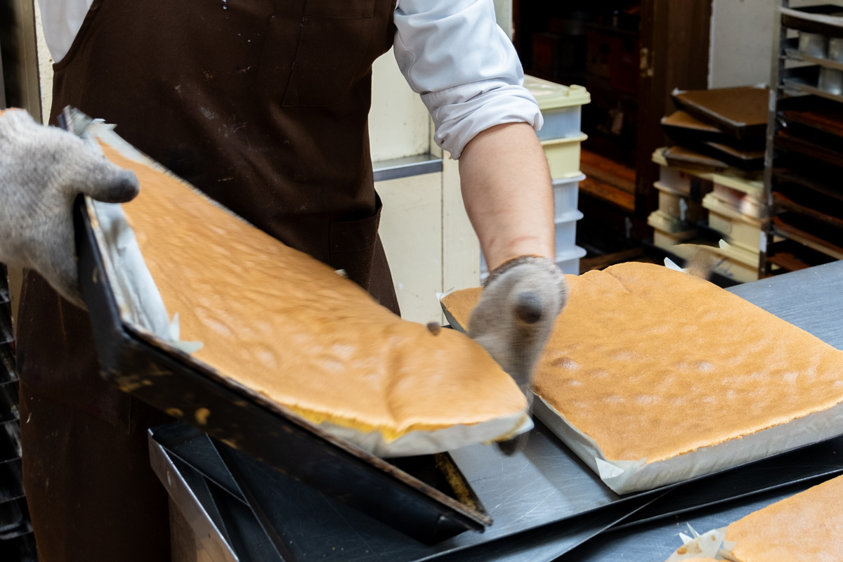職人の目でその日の状態を見極めながら混ぜ合わせた生地を大きな天板に流して均ーに焼き上げることで、ふんわりとキメの整ったスポンジに。
