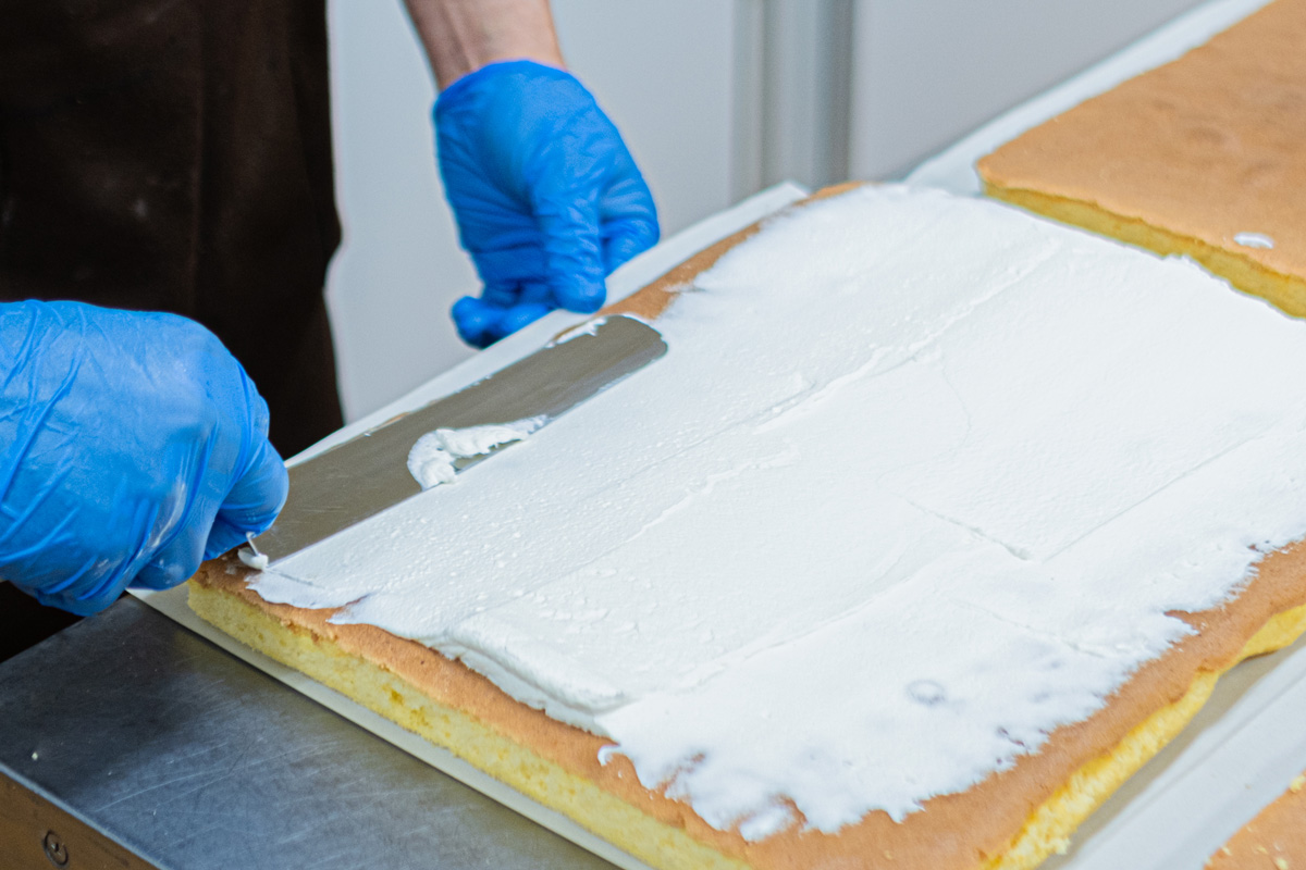 焼き上がったスポンジが冷めたら、なめらかな生クリームを全体にムラなく広げます。