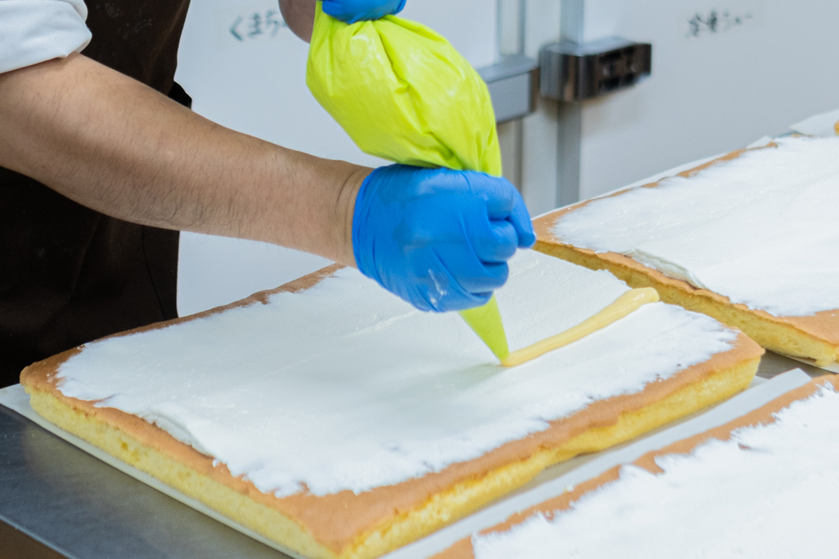 卵のコクを生かした独自の配合の生地を、オーブンで丁寧に焼き上げています。ふんわリと軽いのに、しっとりとしたきめ細かい口あたり。クリームとの相性がよく、くまちゃんロールのおいしさを支える大切な土台になっています。